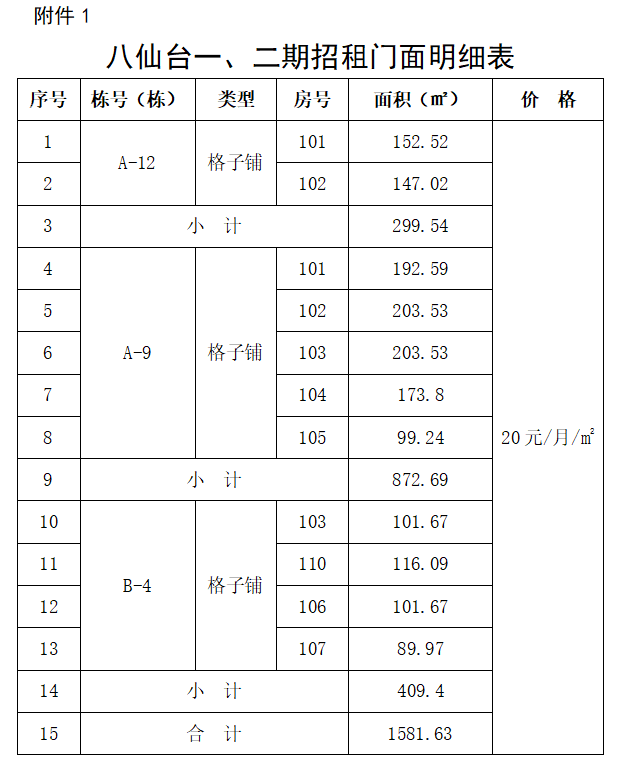 標(biāo)的2:八仙臺(tái)小區(qū)一期、二期門(mén)面位于南湖新區(qū)湖濱街道廖家坡路和黃家坡路,共11間格子鋪可供出租(詳見(jiàn)附件表格),總面積1581.63平方米,月租金20元/平方米/月,首年度按8.5折進(jìn)行優(yōu)惠,自第3個(gè)租賃年度起租金逐年遞增5%。