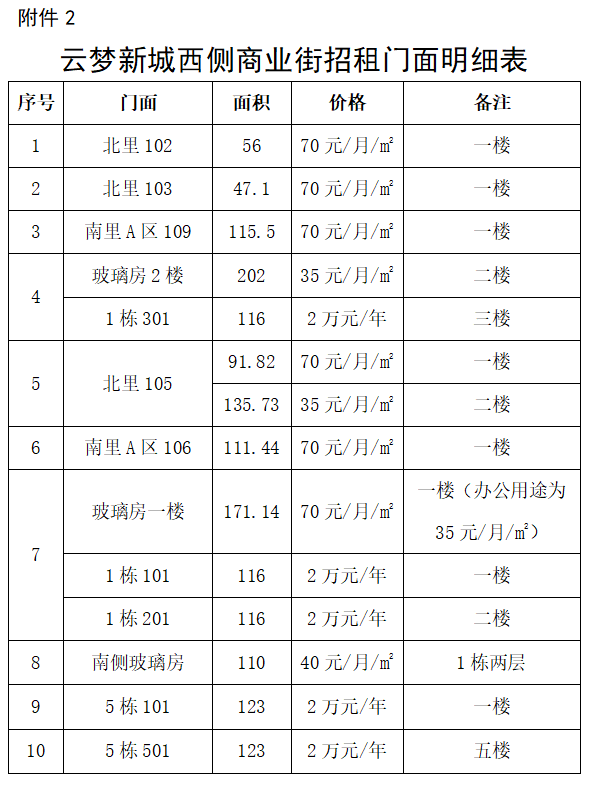 標(biāo)的3:云夢(mèng)新城西側(cè)商業(yè)街及配套房位于南湖新區(qū)云夢(mèng)路,千畝湖對(duì)面,共9間商鋪和5套配套房可供出租(詳見(jiàn)附件表格),總面積1634.73平方米。其中一樓6間,月租金70元/平方米/月;二樓2間,月租金35元/平方米/月;配套房年租金2萬(wàn)/年;玻璃房1間,月租金40元/平方米/月,首年度按8.5折進(jìn)行優(yōu)惠,自第3個(gè)租賃年度起租金逐年遞增5%。