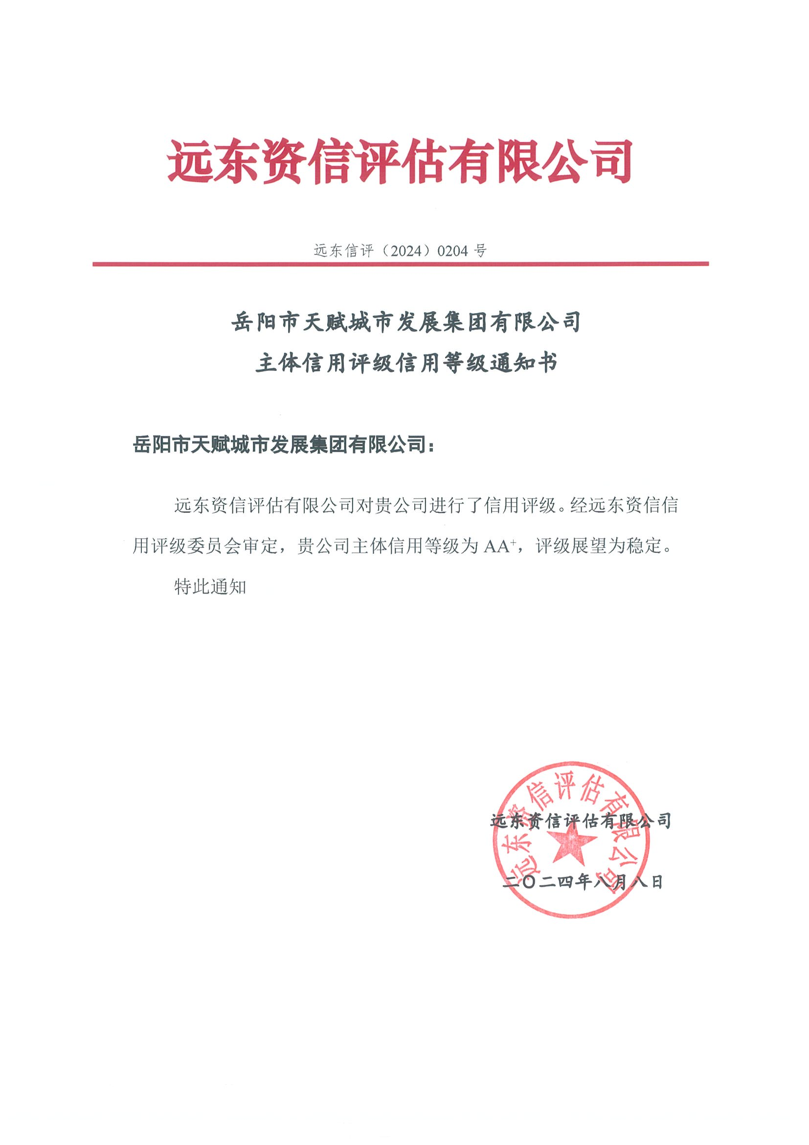 2024年8月8日,經(jīng)國內(nèi)權(quán)威評(píng)級(jí)機(jī)構(gòu)遠(yuǎn)東資信評(píng)估有限公司綜合評(píng)定,岳陽市天賦城市發(fā)展集團(tuán)有限公司獲評(píng)AA+主體信用等級(jí),成為岳陽市第五家獲得AA+信用等級(jí)的市屬國企;岳陽市天賦投資集團(tuán)有限公司獲評(píng)AA主體信用等級(jí),是岳陽地區(qū)唯一一個(gè)獲得AA主體信用評(píng)級(jí)的產(chǎn)業(yè)類投資企業(yè)。