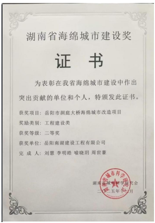 近日,由我集團(tuán)下屬岳陽南湖建設(shè)工程有限公司建設(shè)的洞庭大橋海綿城市項目,經(jīng)岳陽市住建局推薦申報,榮獲湖南省城市科學(xué)研究會頒發(fā)的工程建設(shè)類二等獎。這份榮譽(yù)既是對項目建設(shè)品質(zhì)的高度認(rèn)可,更是對公司專業(yè)實力與專業(yè)技術(shù)水平的充分肯定。