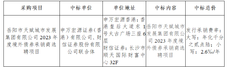 岳陽市天賦城市發(fā)展集團有限公司2023年度境外債券承銷商選聘項目主承銷商采購項目成交結(jié)果公告