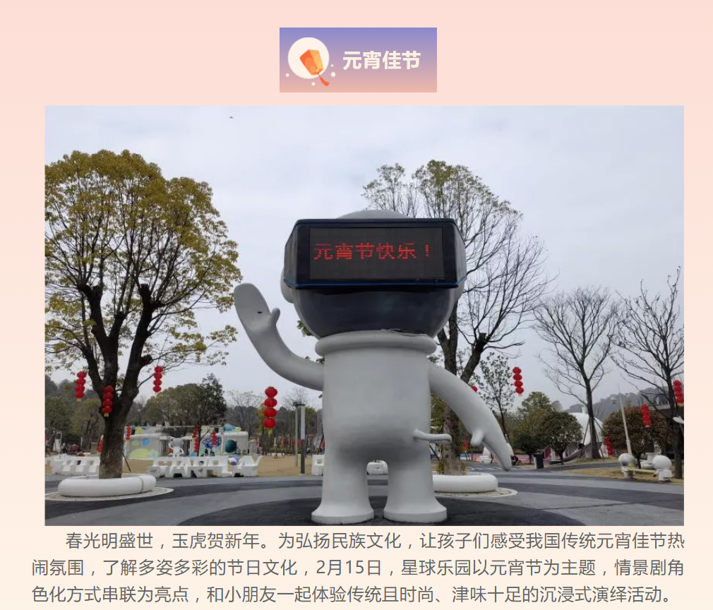 本次星球樂園元宵節(jié)主題演繹活動大獲成功,受到了孩子和家長們的一致好評,節(jié)日氛圍給孩子們留下了深刻的記憶點,為中國傳統(tǒng)節(jié)日文化與孩子們建立聯(lián)結,進一步讓孩子們深刻感受到傳統(tǒng)節(jié)日的歡樂氛圍和獨特的魅力。