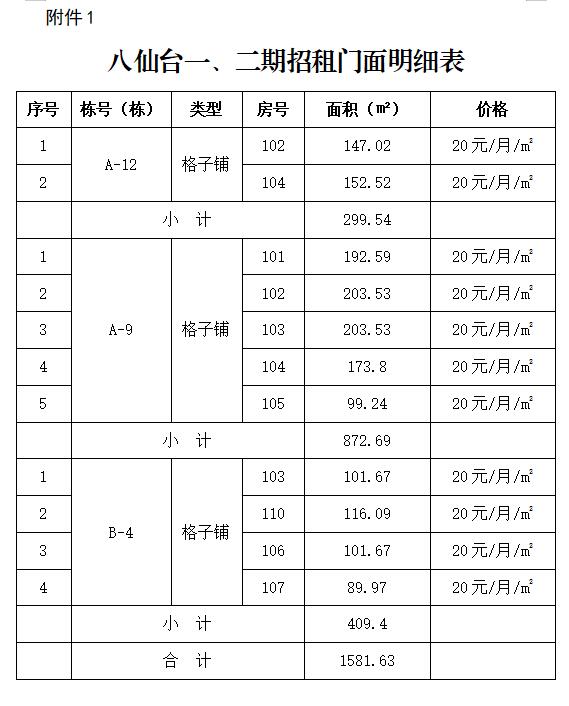 標(biāo)的2:八仙臺(tái)小區(qū)一期、二期門面位于南湖新區(qū)湖濱街道穆家坡路和黃家坡路,共11間格子鋪可供出租(見附件1),總面積1581.63平方米,價(jià)格20元/㎡/月。
