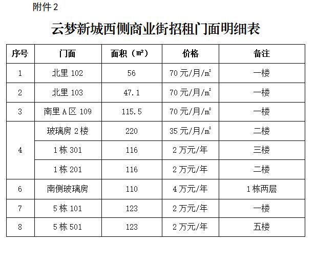 標(biāo)的3:云夢(mèng)新城西側(cè)商業(yè)街及配套房位于南湖新區(qū)云夢(mèng)路,千畝湖對(duì)面,共5間商鋪和4套配套房可供出租(見附件2),總面積1026.6平方米,價(jià)格為一樓70元/㎡/月,二樓35元/㎡/月,商品住宅20000元/年。